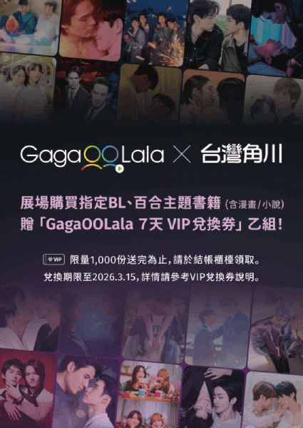 ● 展場購買指定 BL、百合主題書籍(含漫畫/小說),贈「GagaOOLala 7 天 VIP 兌換券」乙組! 限量1,000 份送完為止,請於結帳櫃檯領取。 開通期限至 2026.3.15,詳情請參考 DM 說明。